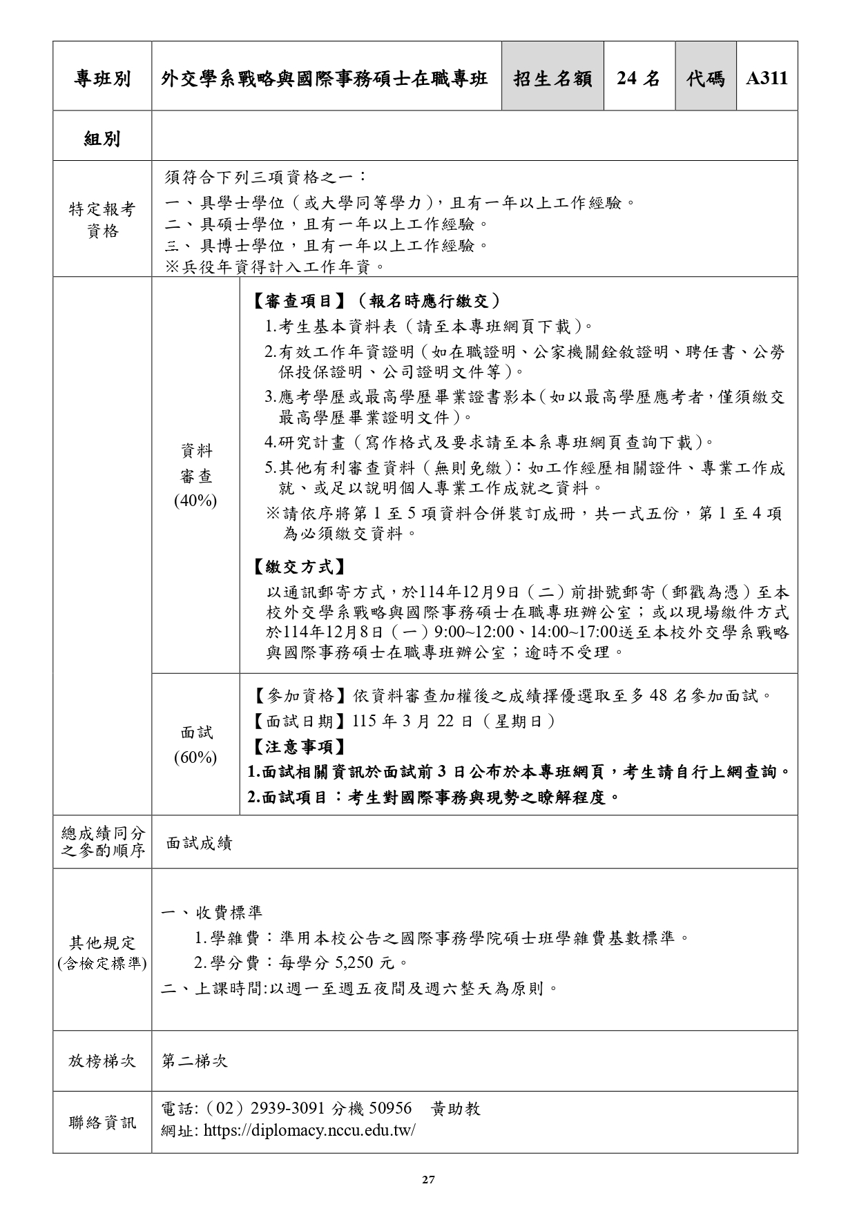 網 址│http://diplomacy.nccu.edu.tw →課程與招生/招生資訊/戰略與國際事務碩士在職專班