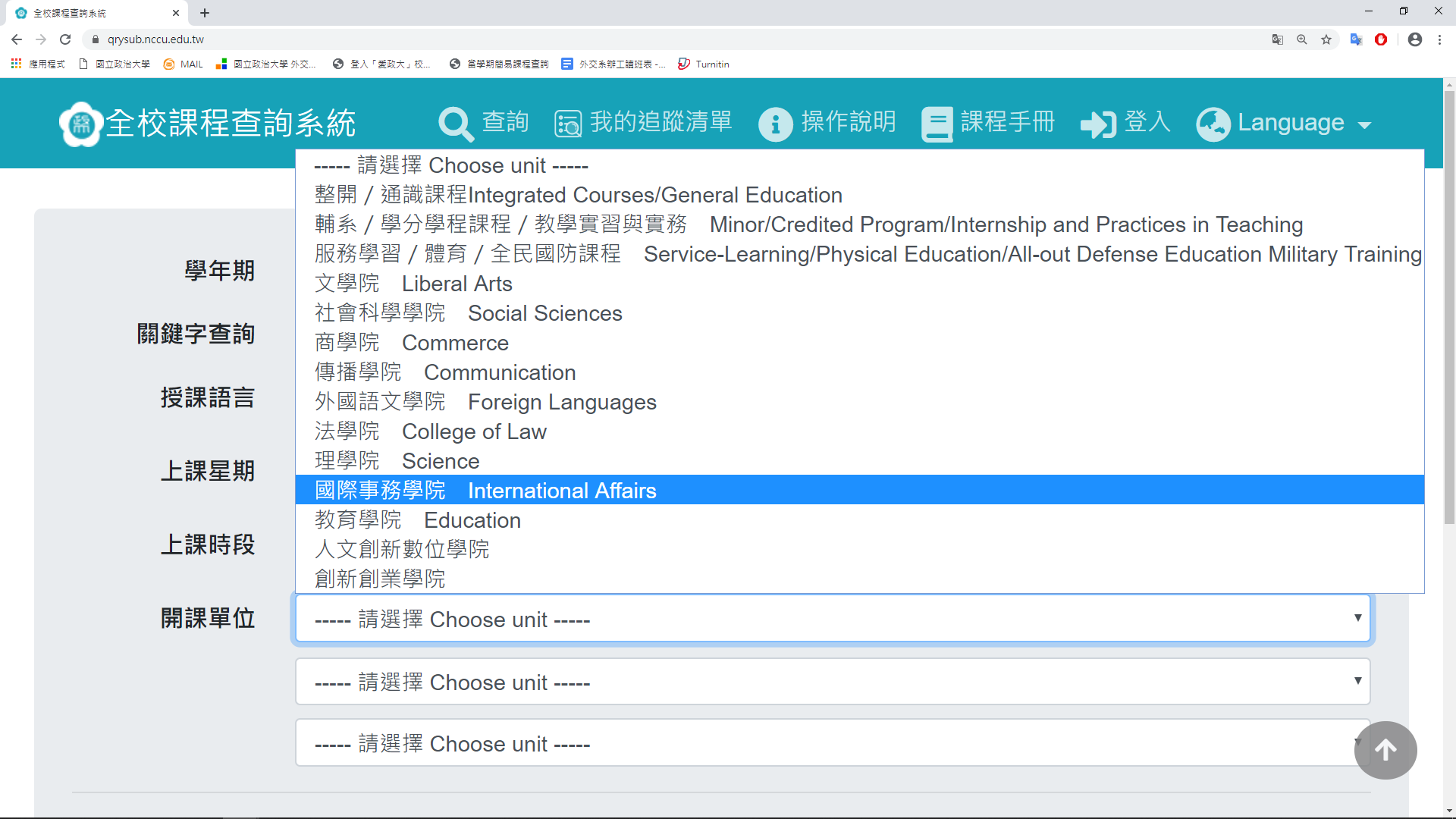 Step 2. 也可在選定欲查詢之學期後點選進階查詢,選定課程開授之學院。